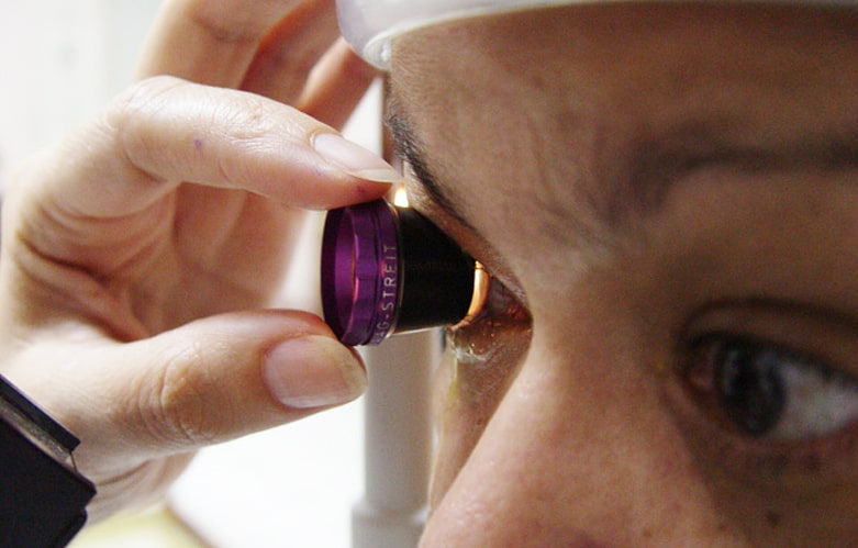 No exame de gonioscopia usamos uma lente especial para melhor visualização da região de drenagem do humor aquoso. Usado principalmente no diagnóstico dos diferentes tipos de glaucoma,